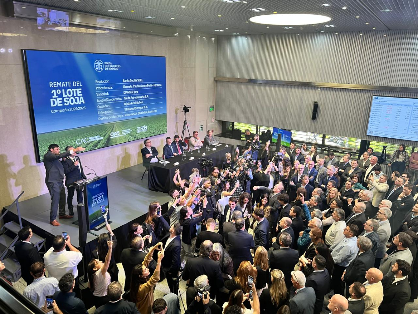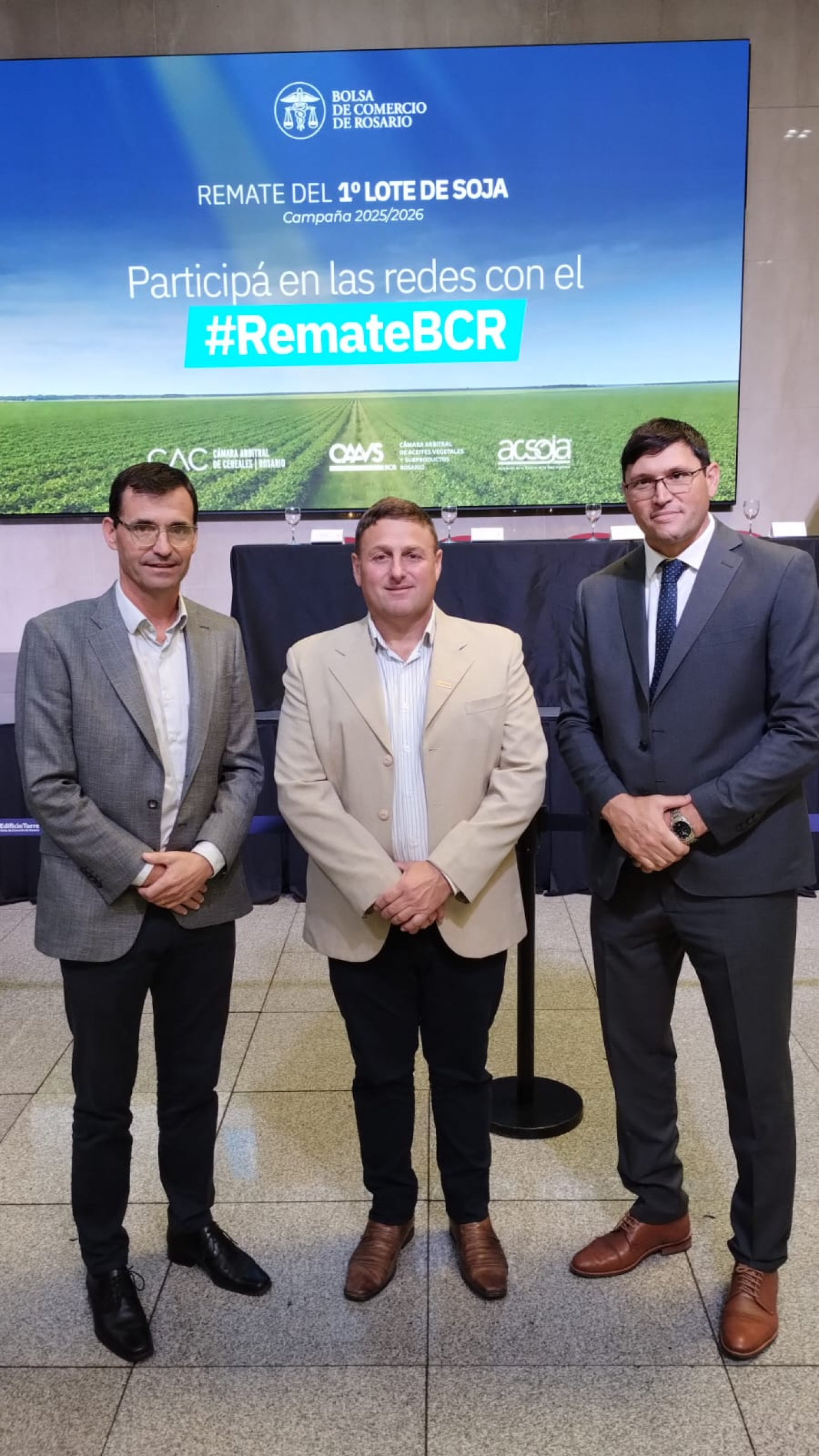 Este viernes 24 de abril, Rosgan realizó en la Bolsa de Comercio de Rosario el Remate del Primer Lote de Soja de la campaña 2025/2026, un evento de fuerte valor institucional que convoca a autoridades y referentes del sector. En esta edición, la consignataria eligió que el martillo de la Cooperativa Guillermo Lehmann condujera la subasta, con la participación de su histórico martillero y Gerente Comercial de Hacienda, Mauricio Tschieder.