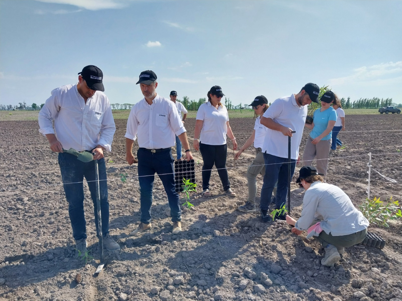 La jornada de plantación comenzó con la meticulosa colocación de plantines, precedida por un día de preparativos intensos que incluyeron marcaciones y planificación detallada del terreno, de la mano de los colaboradores de la Cooperativa y de estudiantes y profesionales de la mencionada facultad.
