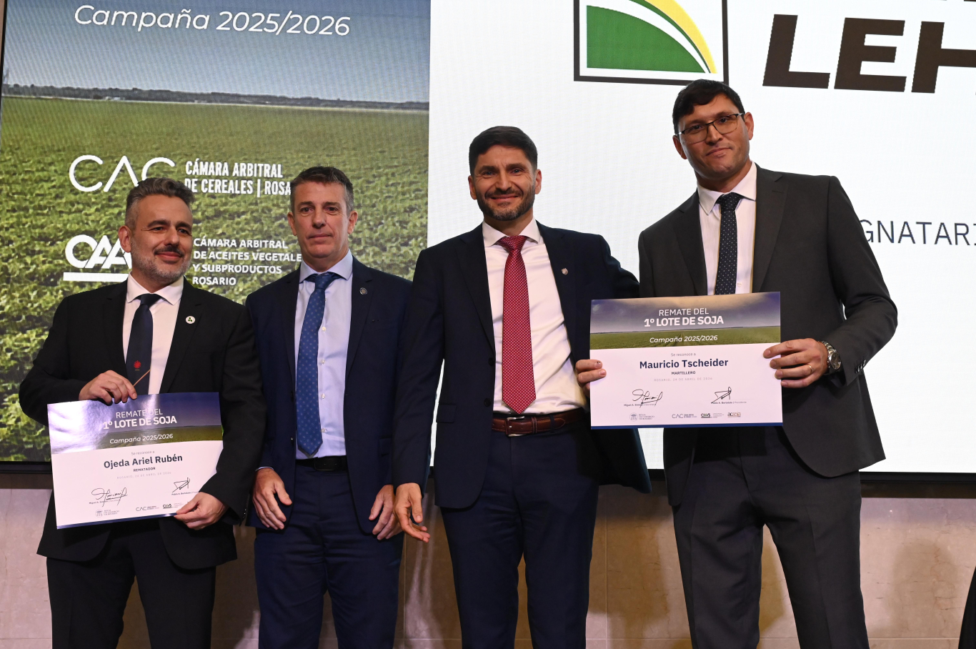 En esta edición, los productores reconocidos por el Primer Lote de Soja 2025/2026 fueron los hermanos Diego y Gabriel Soneira, socios de Santa Cecilia S.R.L. El lote provino de Subteniente Perín, Formosa, y fue el protagonista del remate que Rosgan realza cada año como señal de inicio de campaña.